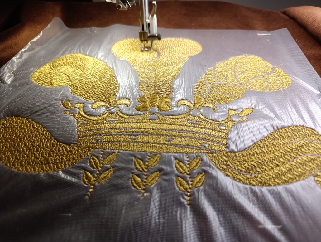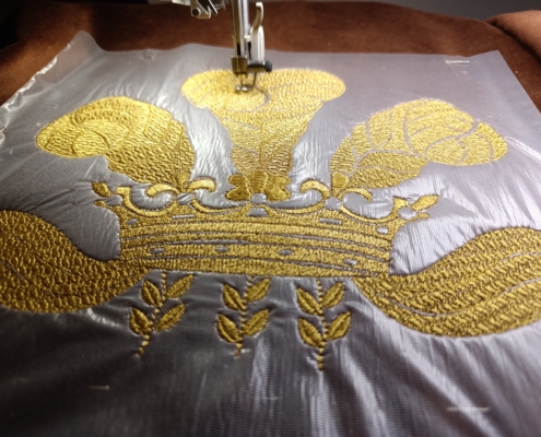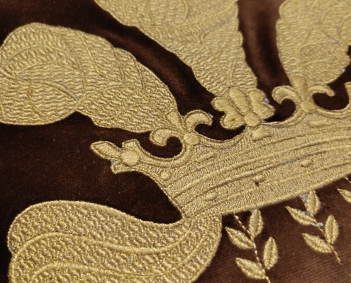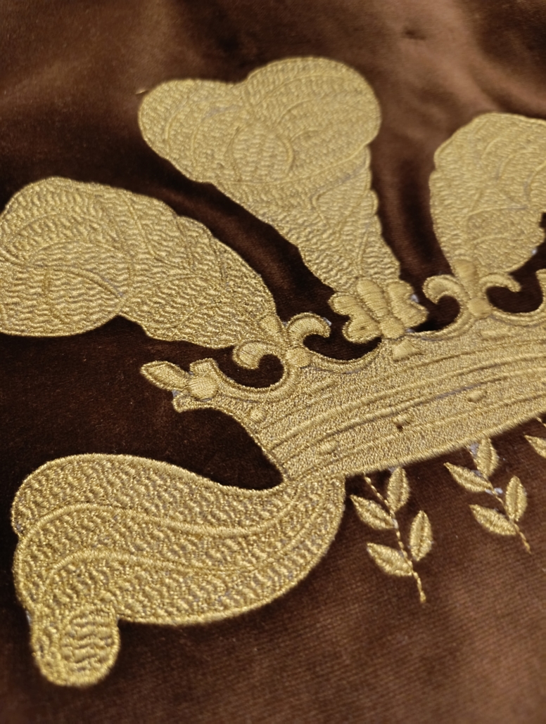 Cette broderie représente une couronne emblématique, symbole intemporel de prestige, de maîtrise artisanale et d’héritage.